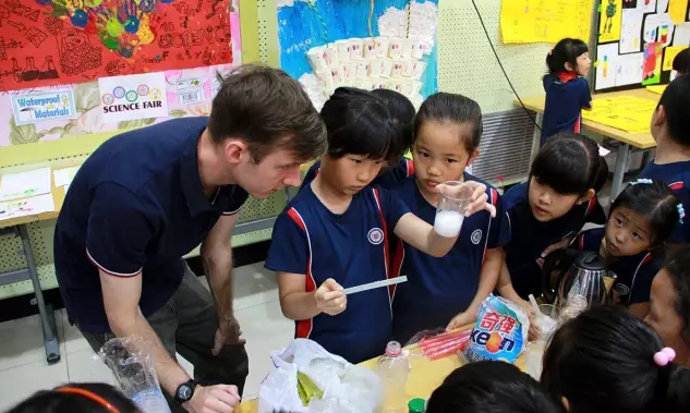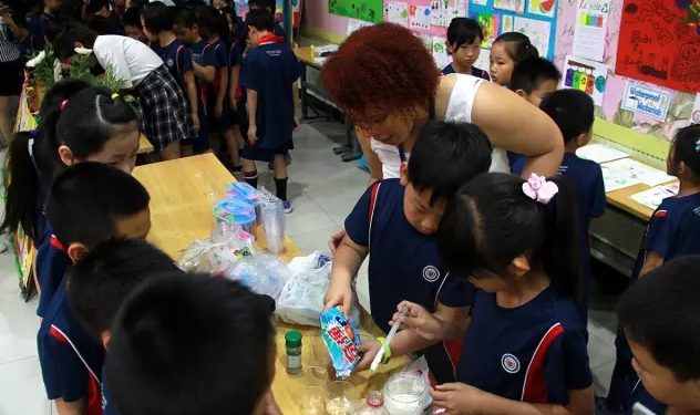 △学生们在外教老师的协助下,进行科学实验和英语交流