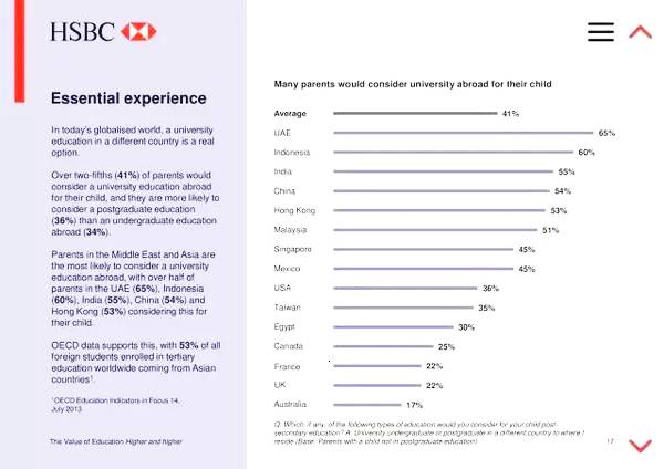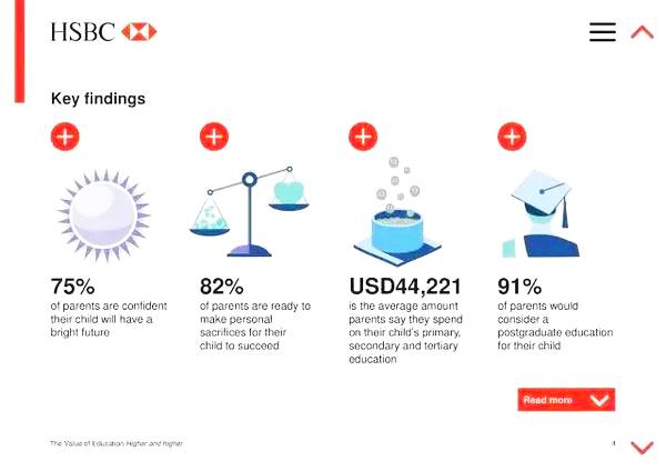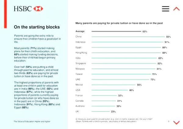 HSBC发布了最新的全球教育报告,对来自全球15个国家,8481对家长的教育投入、教育理念和对孩子的教育预期等方面进行了调查和分析。