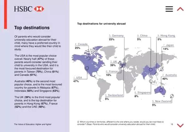 在留学目的地选择上,与全球调查数据一致,中国家长更倾向送孩子去美国留学。