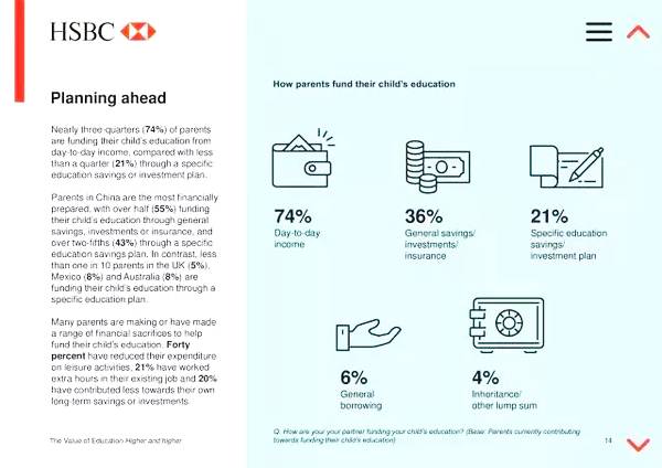 中国家长对孩子的教育支持不遗余力,55%的家长通过储蓄、投资或保险为孩子教育做准备,43%的家长定制特殊的教育储蓄计划。这些指数都远高于其他国家。